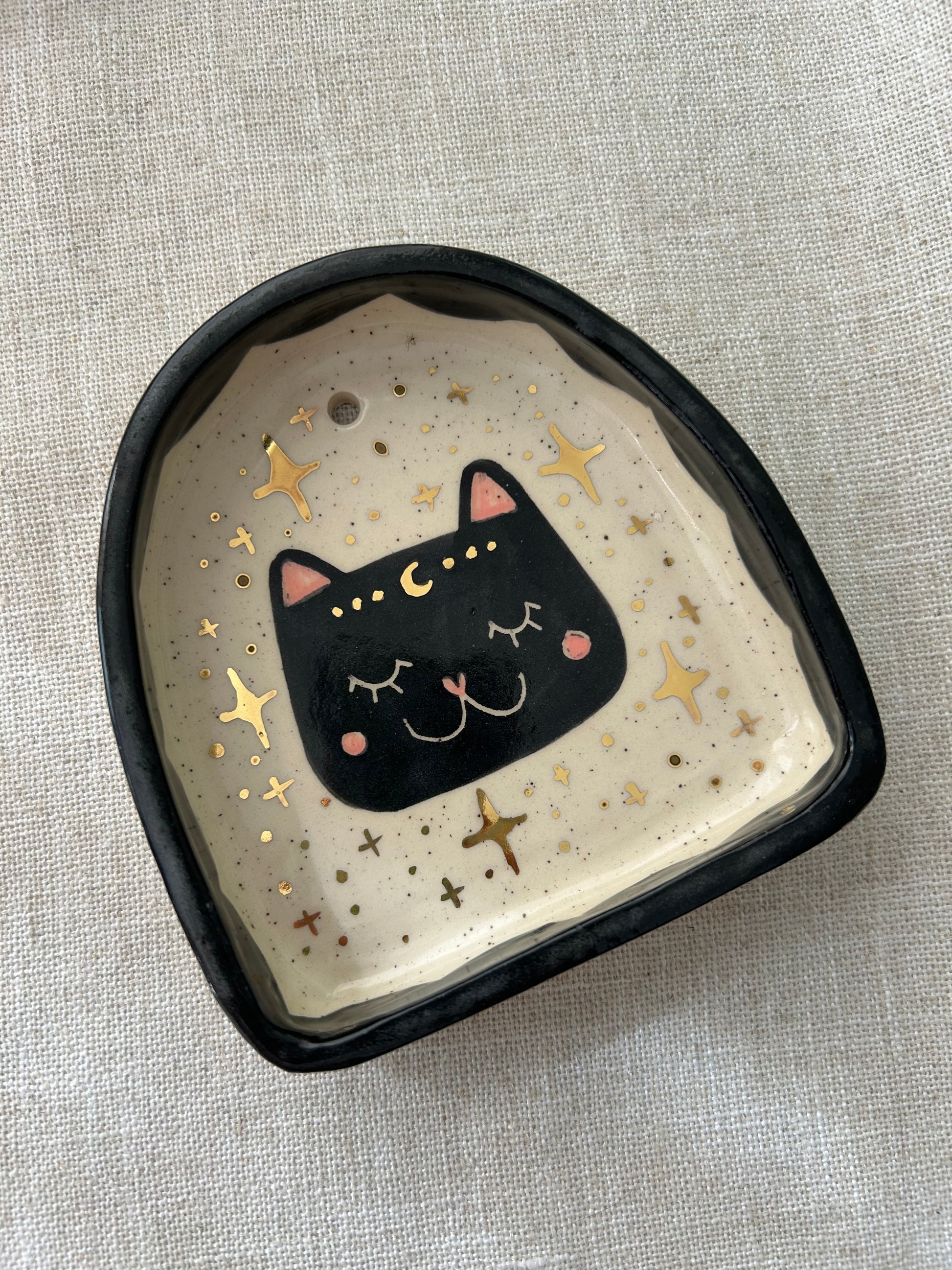 Hand built wall decor with hand painted details. Finished with gold luster.