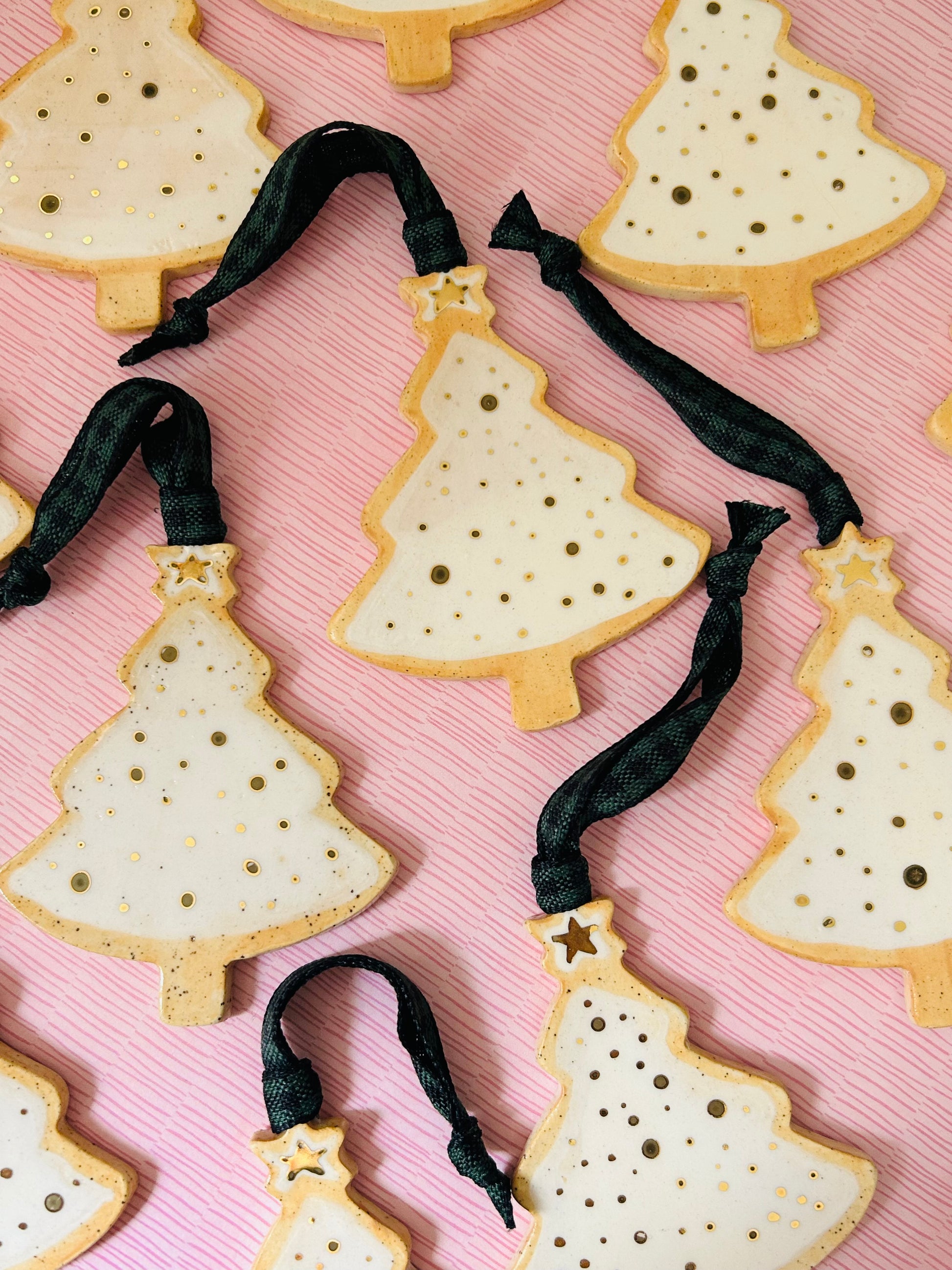 This ornament is handcut, hand painted, and kiln-fired in our home studio. Those shiny gold deets? Real gold!