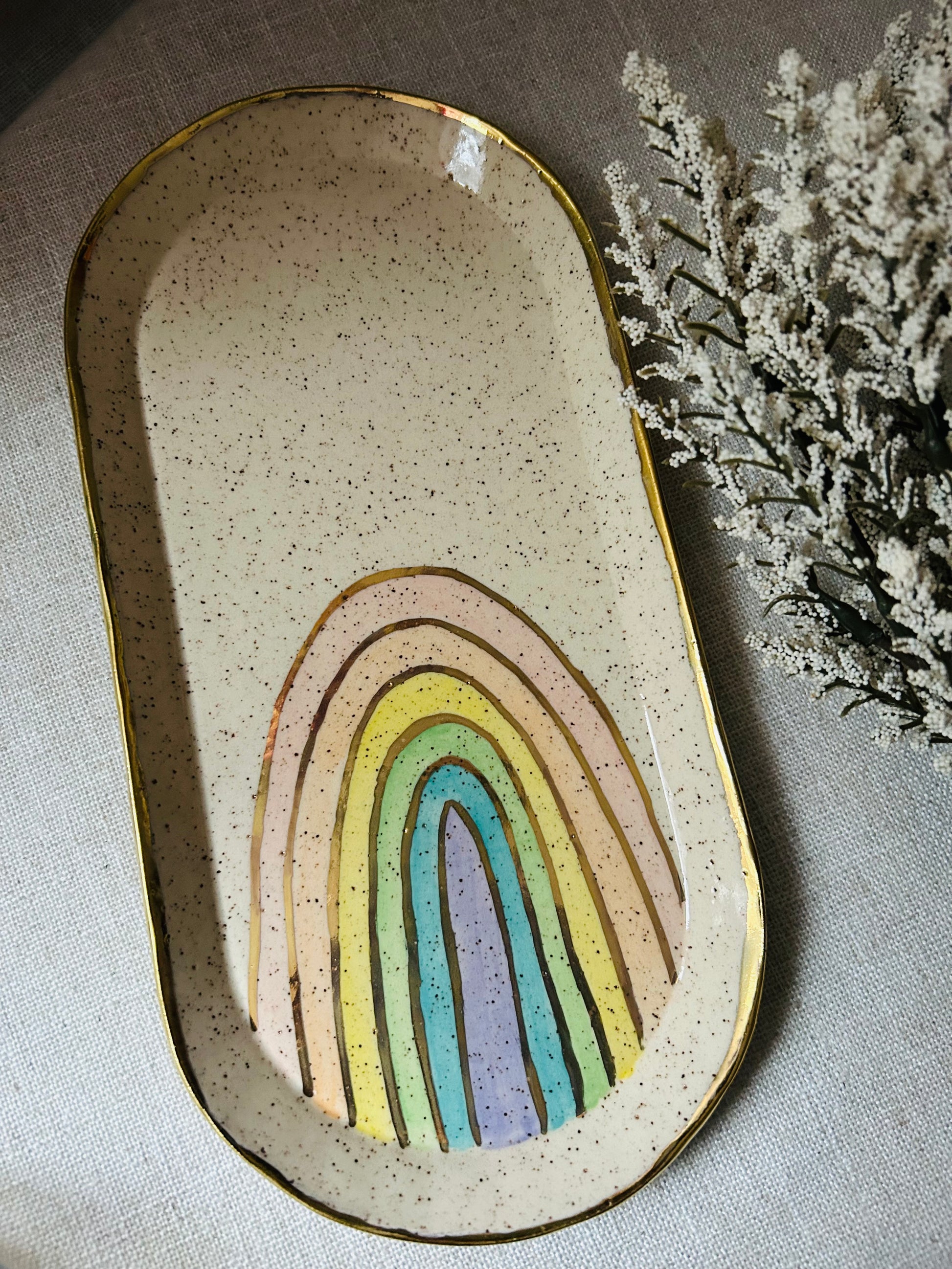 Slab made, hand painted, and finished with gold luster.