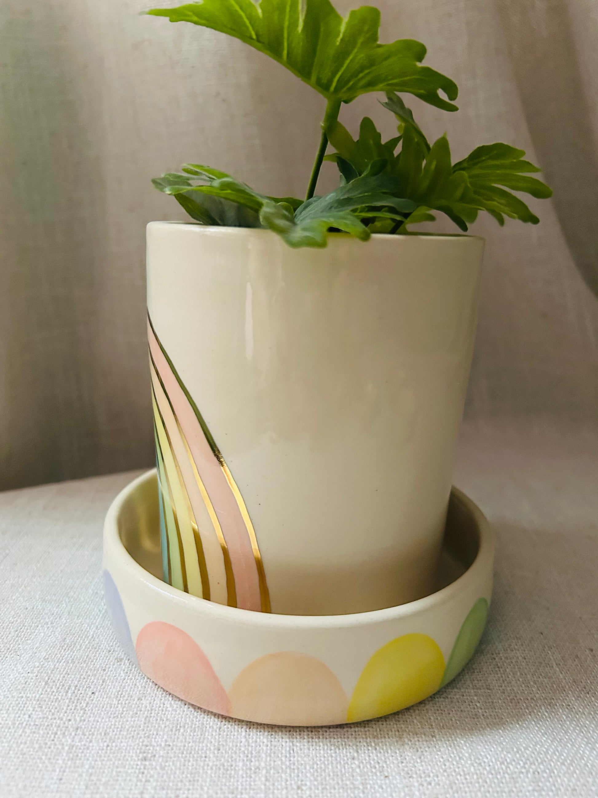 A magnificent planter to hold a magnificent plant. This planter set comes with a drain dish, both hand thrown on the wheel then painted and lustered.