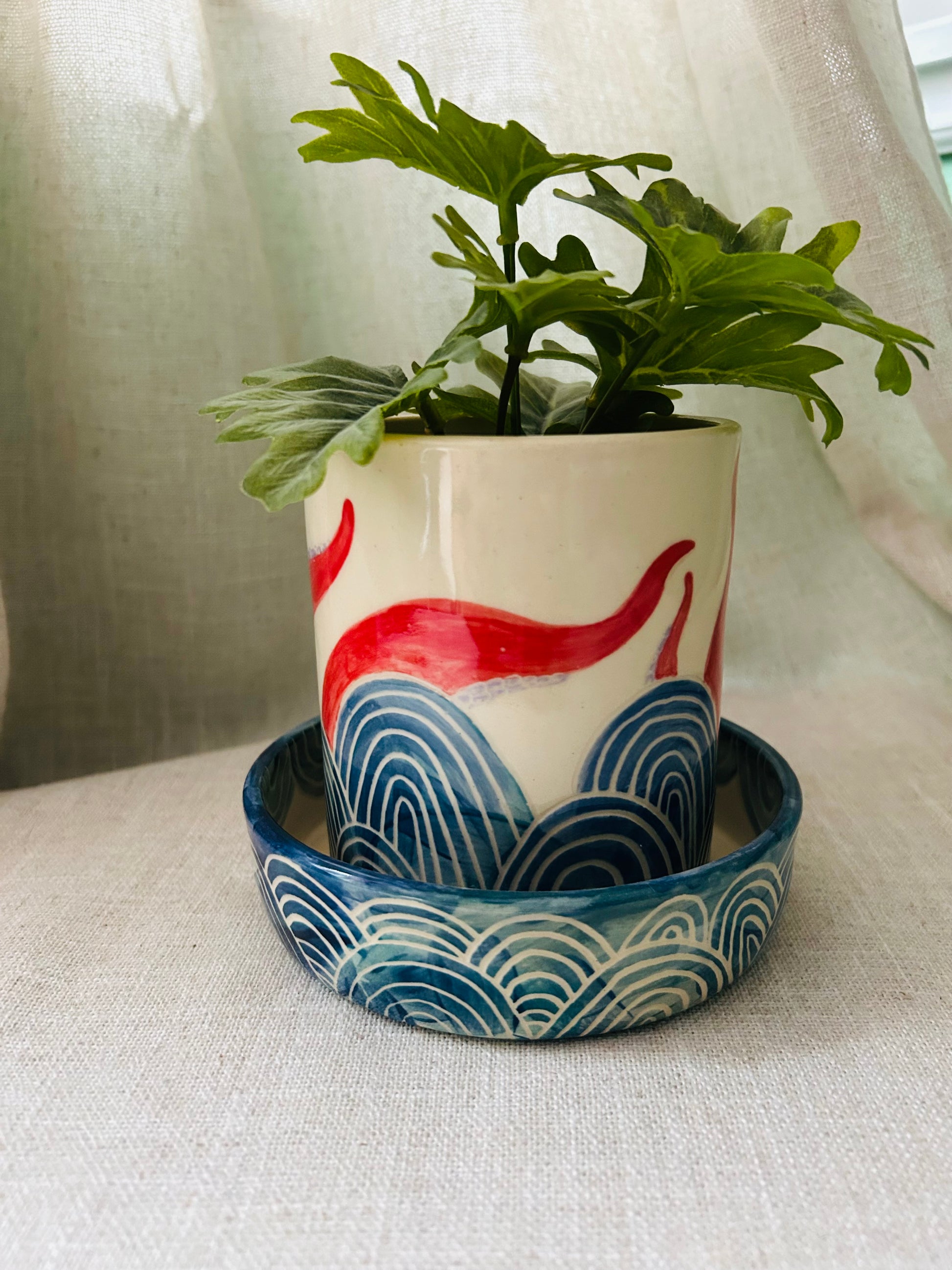 A magnificent planter to hold a magnificent plant. This planter set comes with a drain dish, both hand thrown on the wheel then painted and carved.